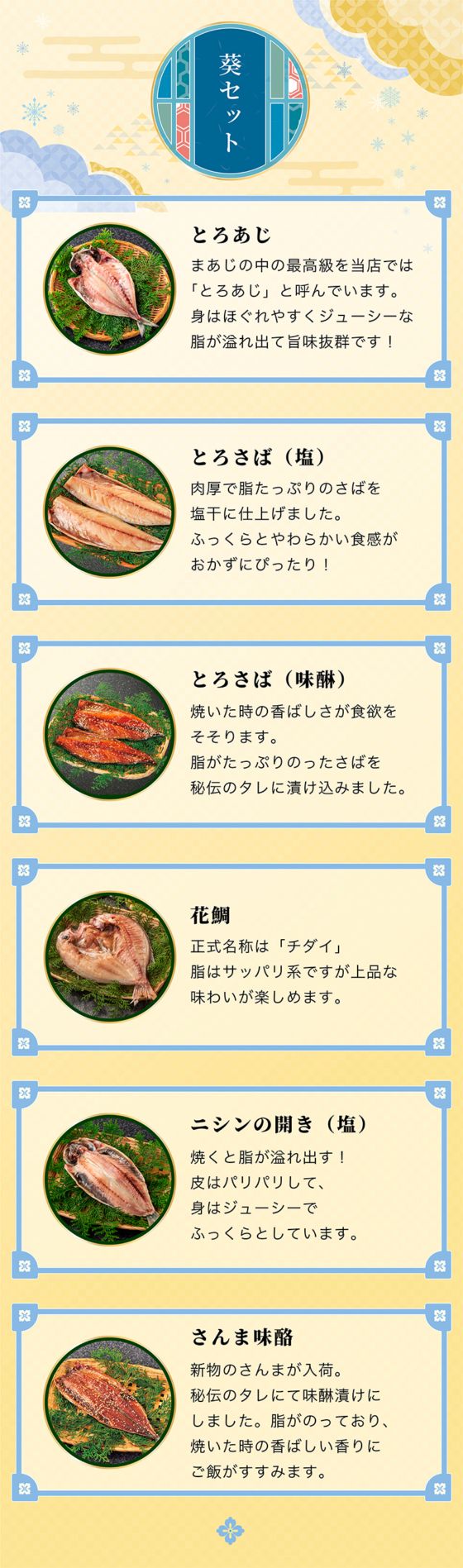 脂ののった大人気「とろあじ」、上品な味わい「花鯛」、身がジューシー「ニシンの開き(塩)」、肉厚で脂たっぷり「とろさば(塩・味醂)」、焼いた時の香ばしさが最高「さんま味醂」の入った詰め合わせです。