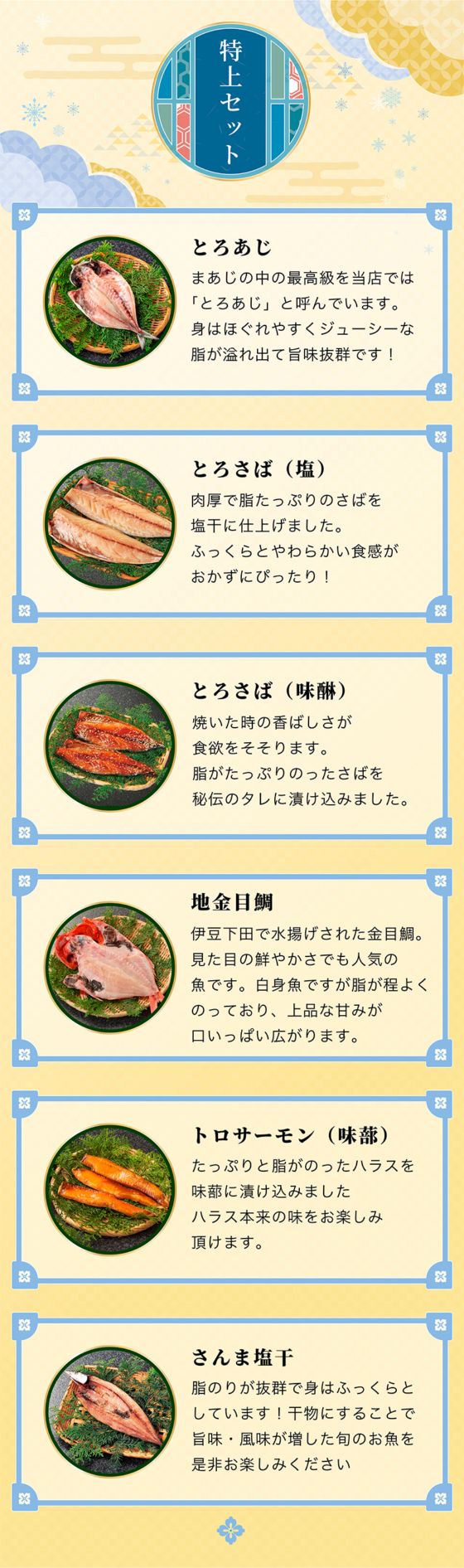 まあじの最高級「とろあじ」、見た目の鮮やかさでも人気「地金目鯛」、脂がのったハラスを味醂に漬けた「トロサーモン(味醂)」、肉厚で脂たっぷり「とろさば塩・味醂」、新物なので鮮度抜群「さんま塩干」の入った詰め合わせです。